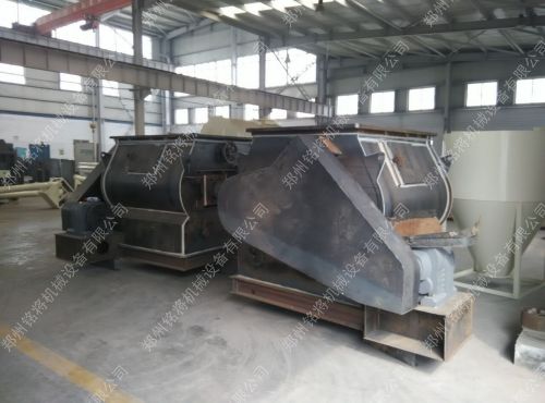 用在全自動干粉砂漿生產(chǎn)線上的雙軸無重力混合機已經(jīng)組裝完畢,只等噴漆了。